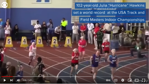 102 year old Julia “Hurricane” Hawkins set a world record at the USA Track and Field Masters Indoor Championships