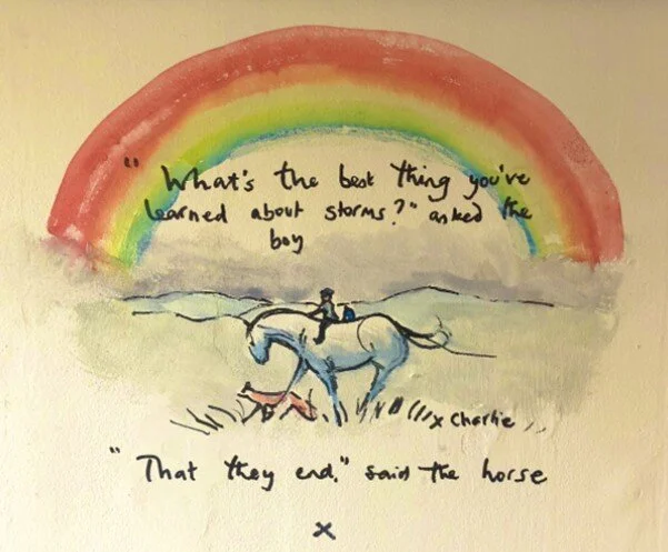 The message and illustration below are not from his book but from the wall of The Black Dog Deli in Walberswick, Suffolk, which is owned by Charlie’s friends. It references the pandemic but is also a message of comfort to anyone going through troubled times.