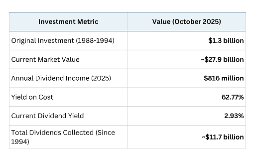 Today, those 400 million shares represent 9.3% of Coca-Cola, and the investment has become one of the greatest dividend success stories in corporate history. As of October 2025, Berkshire Hathaway receives $816 million annually in dividends from Coca-Cola — that's $204 million every quarter, or approximately $2.23 million every single day.