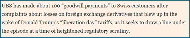 1. Our biggest clients came from UBS in 2008 and 2009; during the credit crunch the bank itself came under a sticky amount of pressure trying to stay afloat, so simply refused to work with retail clients whose own money was stuck. Next, at the beginning of this year the bank’s clients lost money on a foreign exchange derivative position they had been sold, following the Tariff Tantrum. According to the FT “one client lost more than SF3mn, and a second lost 15% of their assets. “I repeatedly expressed concerns about the product and said I did not understand it. They kept telling me not to worry…”