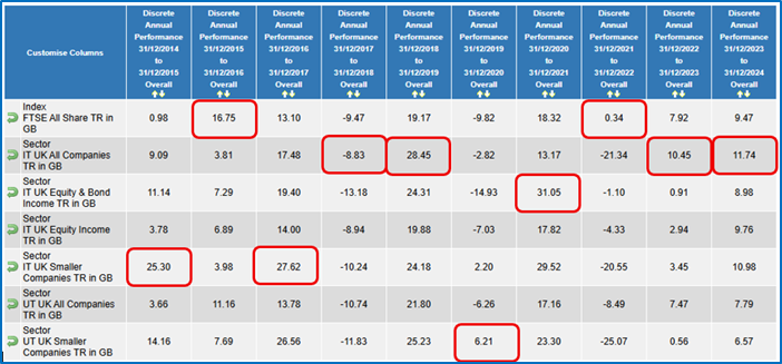 Two things stick out in this table: for 80% of the time measured the index was beaten by active managers, and for 70% of the time investment trusts in the broad UK all companies and smaller companies sectors outperformed unit trusts. We have to research unit trusts, pension funds and ETFs to ascertain which investment structure tends to do best; we are investment agnostic, our task is wonderfully broad in directing us to simply hunt for the best.